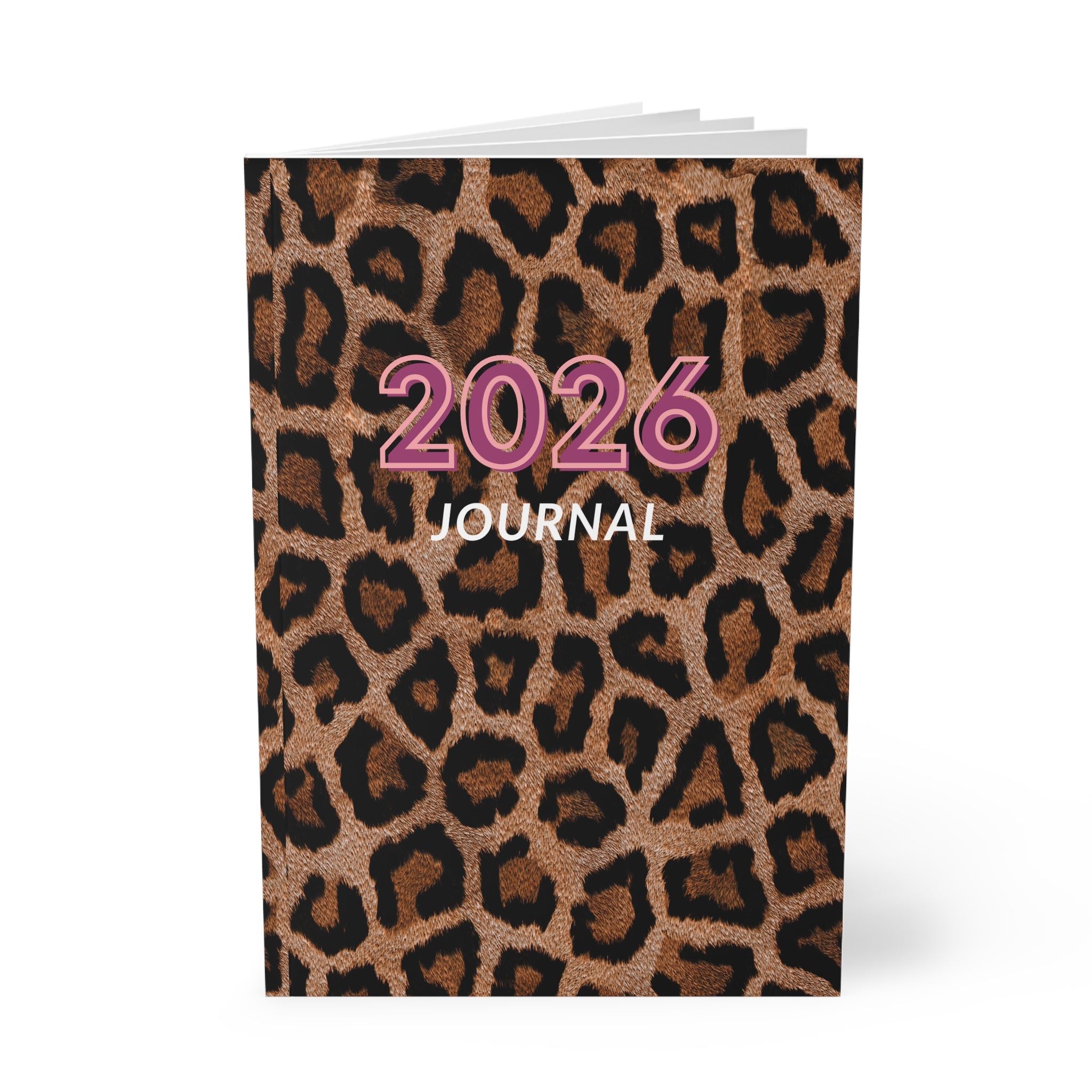 A5 softcover journal wrapped in a bold leopard-print cover with a matte laminated finish. The flexible perfect binding lets the notebook lie flat while you write, sketch, or plan. Inside are 150 pages (75 sheets) of 90gsm lined paper that take pen strokes cleanly and resist bleed-through. The cover features a vibrant, high-resolution print on both front and back — the front marked with a confident “2026 JOURNAL” in pink and white lettering that stands out against the warm, textured spots. Compact and lightweight, it slips easily into a tote or desk drawer so your thoughts and plans are always close at hand.